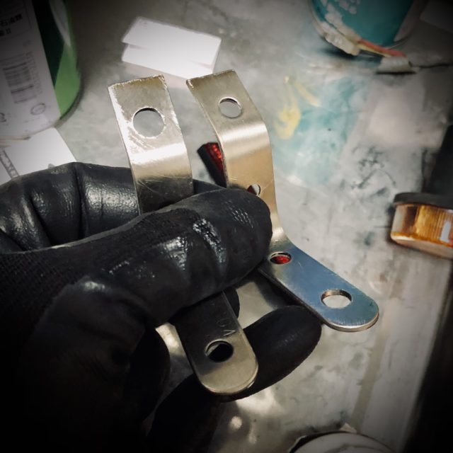 折れちゃったナンバーステーは穴いっぱいで厚さ0.5mmくらいの汎用ステーだったもんでSRVの振動に耐えきれなかった模様。