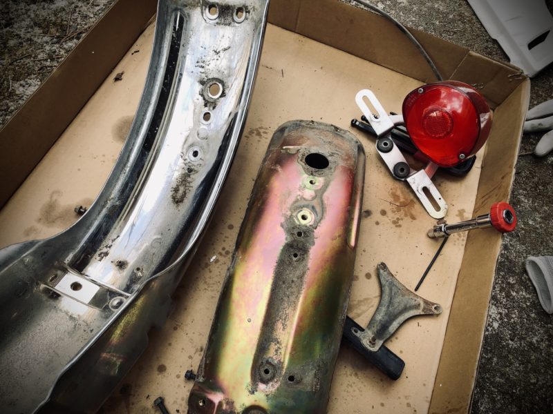 フェンダーはメッキクリーナーで磨いてみたけど、手入れしづらい部分は腐食が進んでてぜんぜんダメだ…