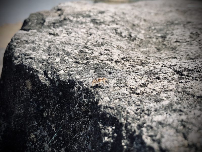 したっけ小さいクモが直射日光で温まった岩の上でお尻を上げて足を伸ばしてる。
