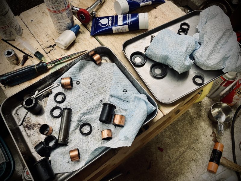 外したら掃除して新しいブッシュを入れる。