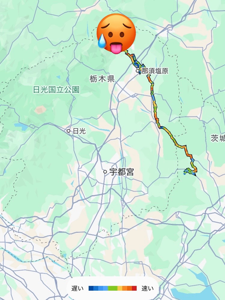 レーダーの履歴見たら那須街道の方が降ってなかったかも?ということで引き返して那須街道経由で帰った。