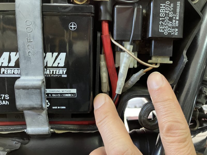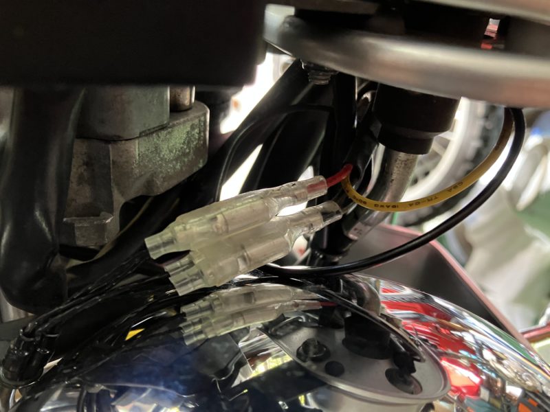 グリップヒーター不動確認2025.11.03BRONCOテキトー整備記録まさかの故障。走る気にならないので原因究明。結果はリレーだった。バッテリー直にしたら動いた。取り付けの記録ちゃんとしなかったから忘れてた。ので記録。ライト上でヒーターとコントローラと電源が接続。黄がリレーを経由してバッテリーから来る電源?シート下にリレー。青がパイロット。赤がバッテリーからヒューズ経由しての電源入力。黄色が電源出力。黒はアース。白は知らんメクラしてある。パイロットは右サイドカバー内から取ってる。二股を割り込ませてる。